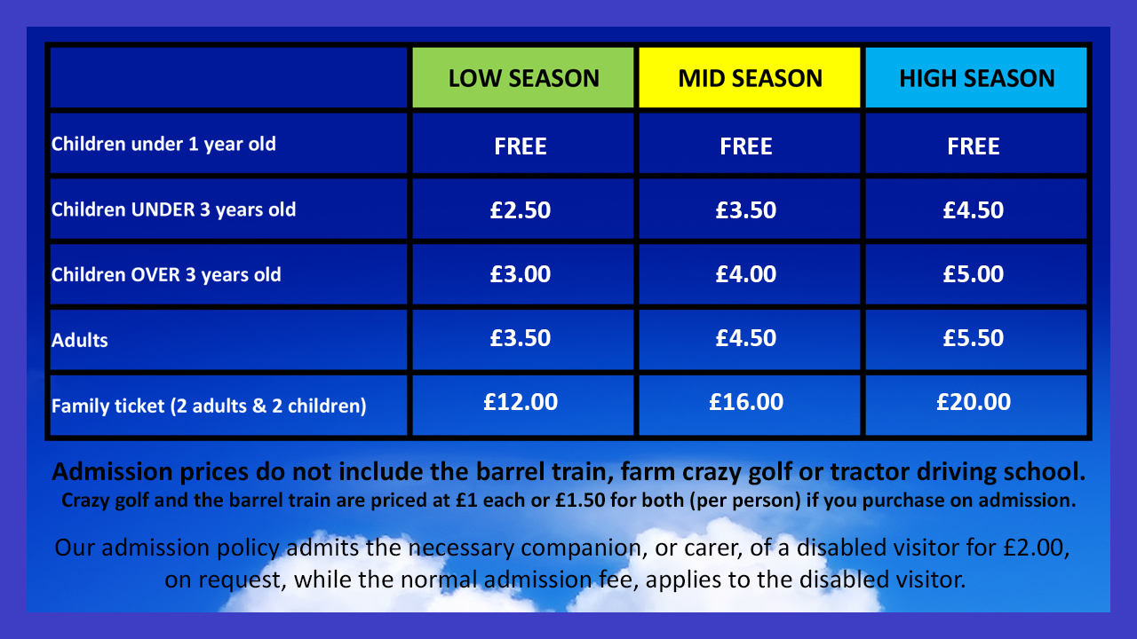 We offer two different pricing structures for your visit, offering a low season rate Wednesday - Friday during term-time when you can pop along and enjoy our farm attractions.